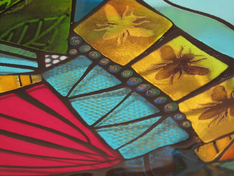 A tribute to bees, and also a tribute to quilting, as the patchwork feeling reminds of handmade crazy quilts.